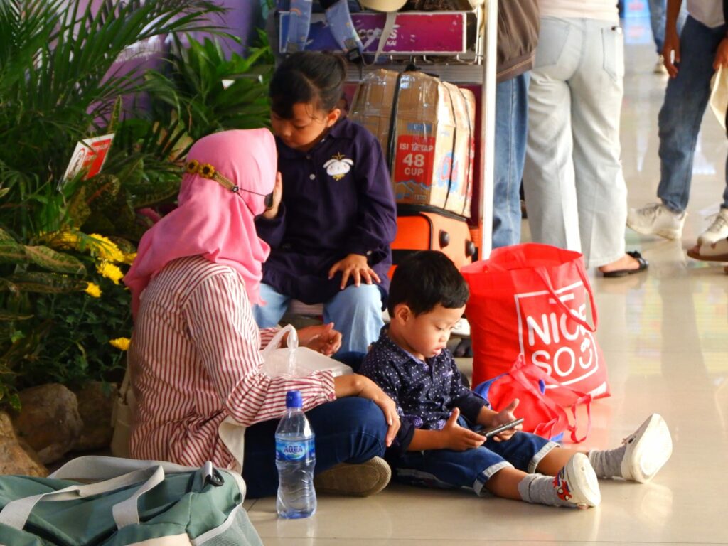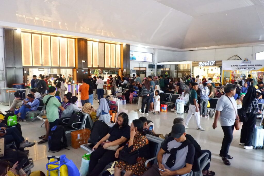 Sejumlah penumpang tampak memadati area keberangkatan dan ruang tunggu pada hari Minggu (15/3/2026).