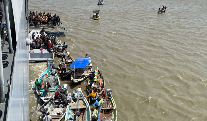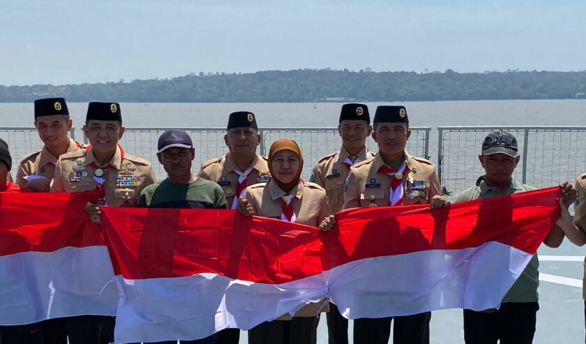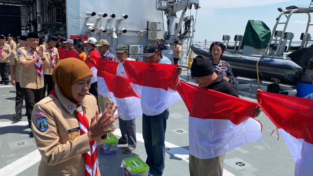 Khofifah Indar Parawansa Gubernur Jawa Timur bersama Kwartir Daerah (Kwarda) Gerakan Pramuka Jatim menggelar bakti sosial membagikan sembako kepada 300-an nelayan di Selat Madura pada Kamis (14/8/2025).