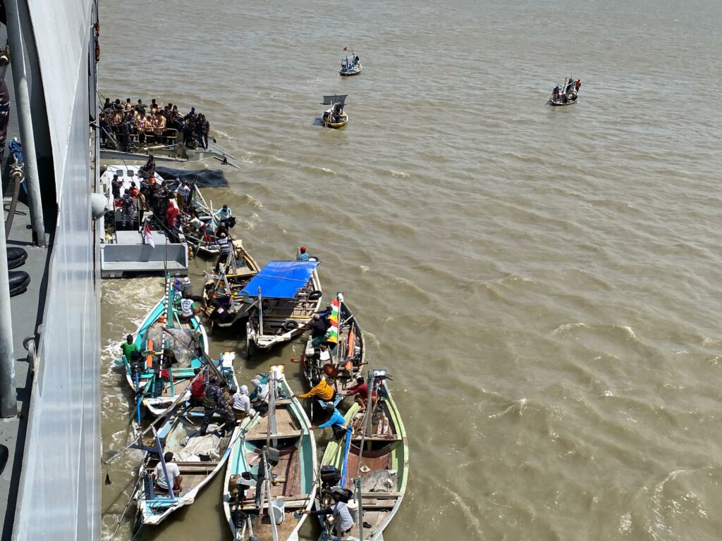 antauan suarasurabaya.net Khofifah turut membagikan paket sembako kepada 30 orang perwakilan nelayan di atas KRI Surabaya 591.
