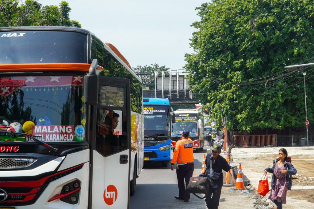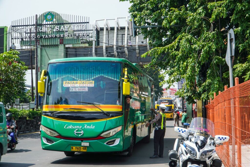 Petugas gabungan dari Polresta Sidoarjo dan Dinas Perhubungan Sidoarjo terus melakukan penertiban bus yang ngetem di area jalan raya Waru Sidoarjo arah Surabaya imbas perbaikan pintu keluar terminal.