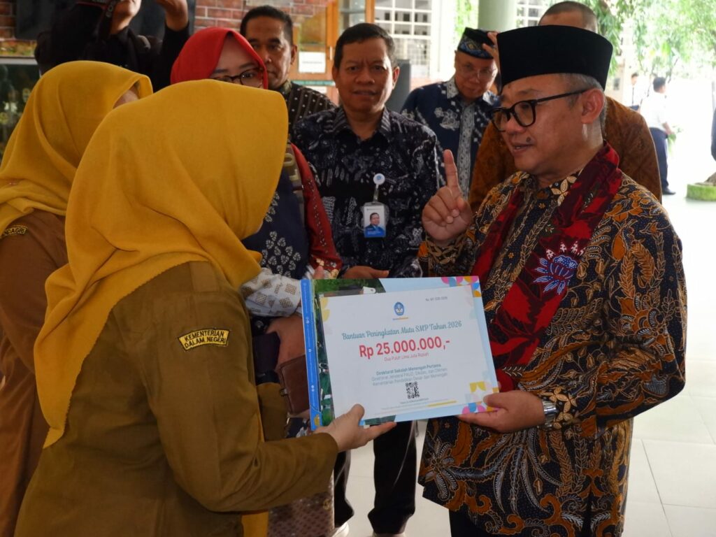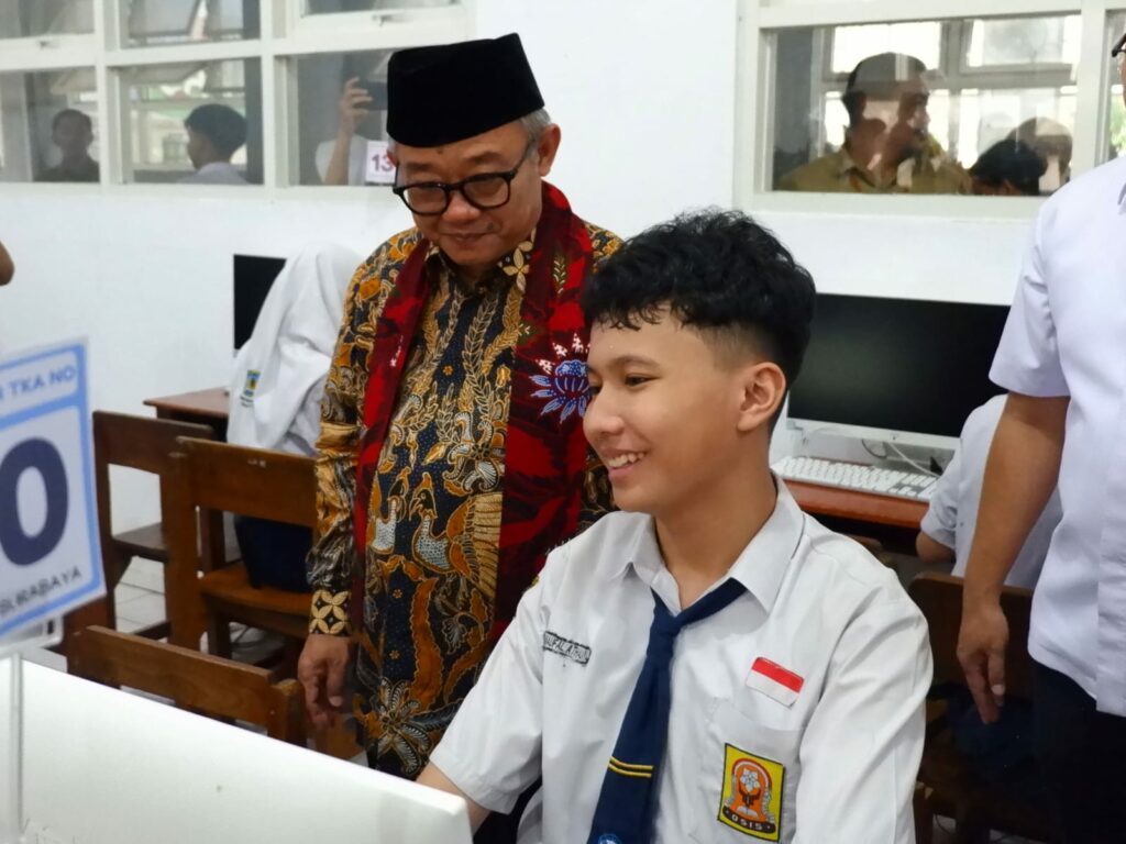 Abdul Mu’ti Menteri Pendidikan Dasar dan Menengah meninjau langsung pelaksanaan Tes Kemampuan Akademik (TKA) perdana di SMP Negeri 1 Surabaya pada Selasa (7/4/2026).