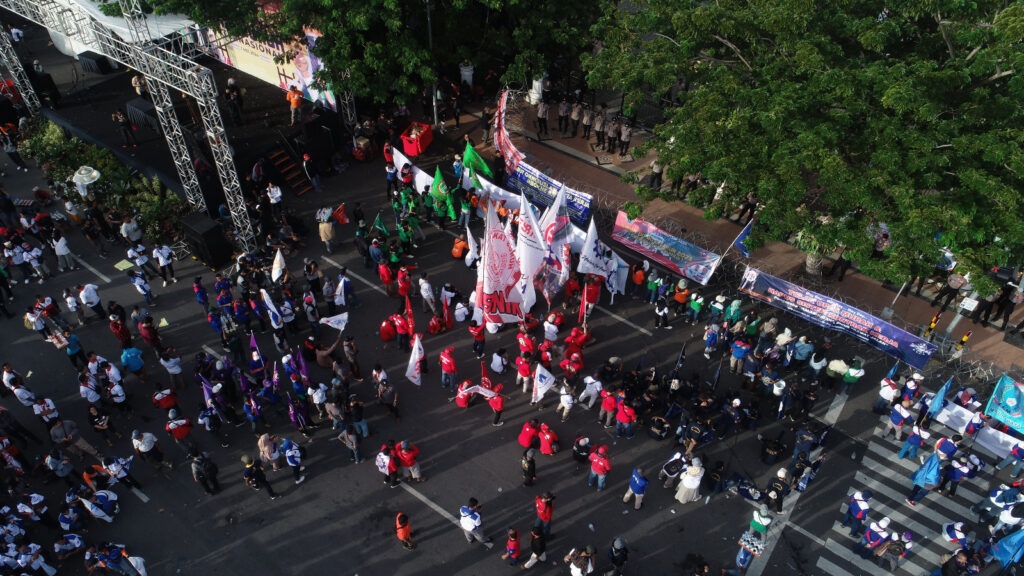 Sementara, ribuan pendomo yang baru tiba di Jalan Pahlawan langsung mengambil pososi di depan gedung kantor gubernur untuk segera melakukan orasi. Para pendemo juga nampak mulai menyiapkan berbagai atribut seperti poster, banner, hingga bendera untuk menyampaikan aspirasi dan sejumlah tuntutan mereka.