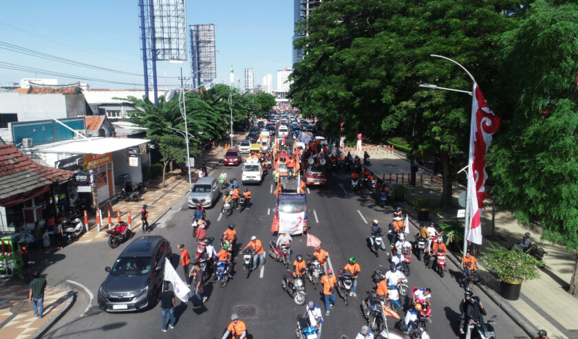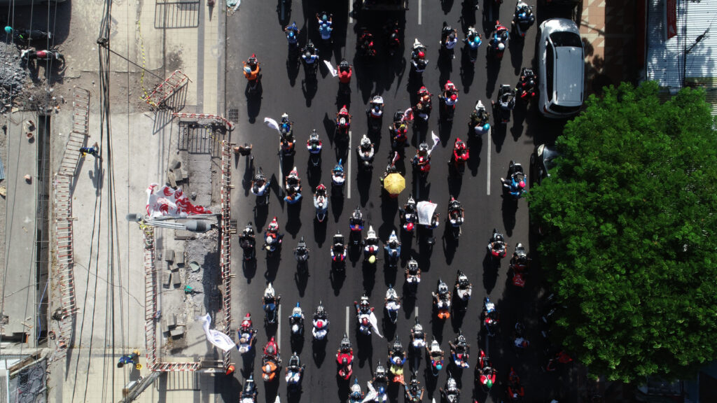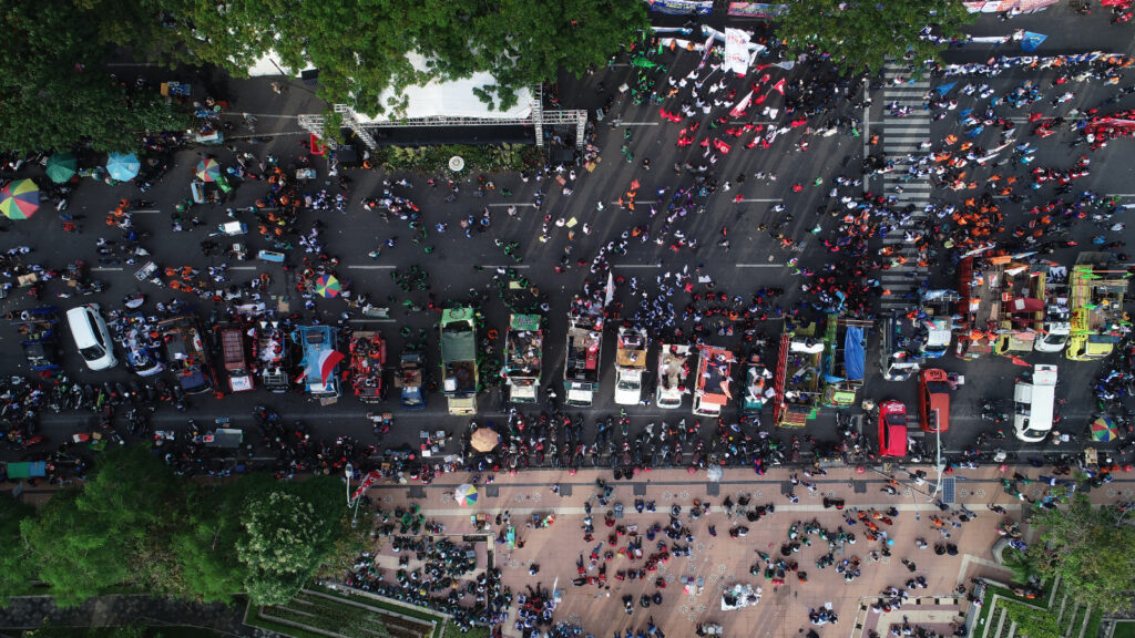 Terpantau dari udara, massa yang berkumpul dari frontage Jalan Ahmad Yani tampak mulai memadati jalan Embong Malang saat menuju ke titik aksi yakni di Kantor Gubernur Jawa Timur (Jatim) yang berada di Jalan Pahlawan.