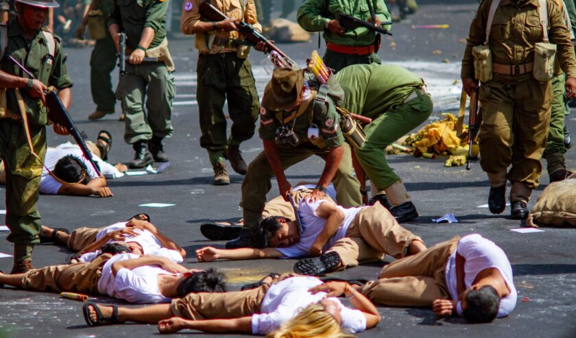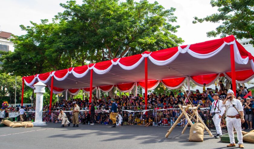 Pertunjukan pertempuran perjuangan membuka rangkaian Parade Surabaya Juang di Monumen Tugu Pahlawan.