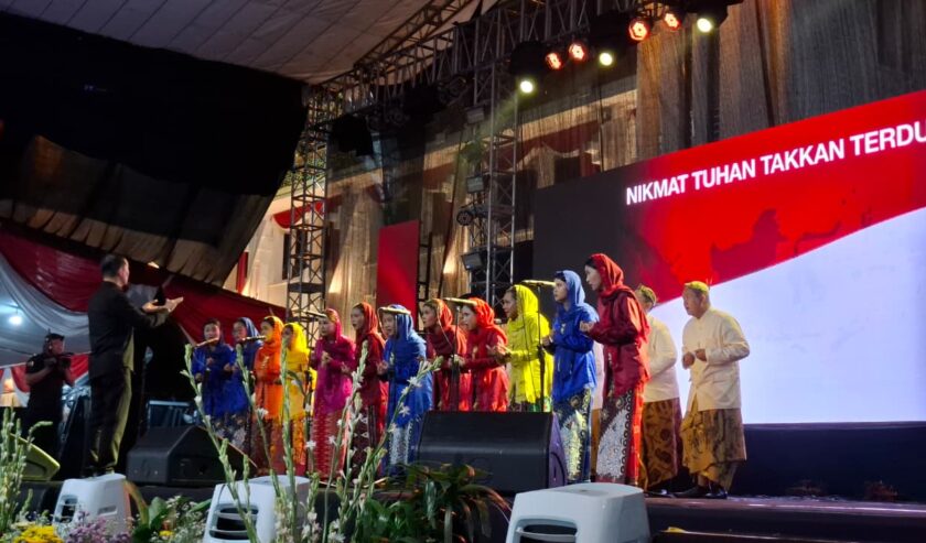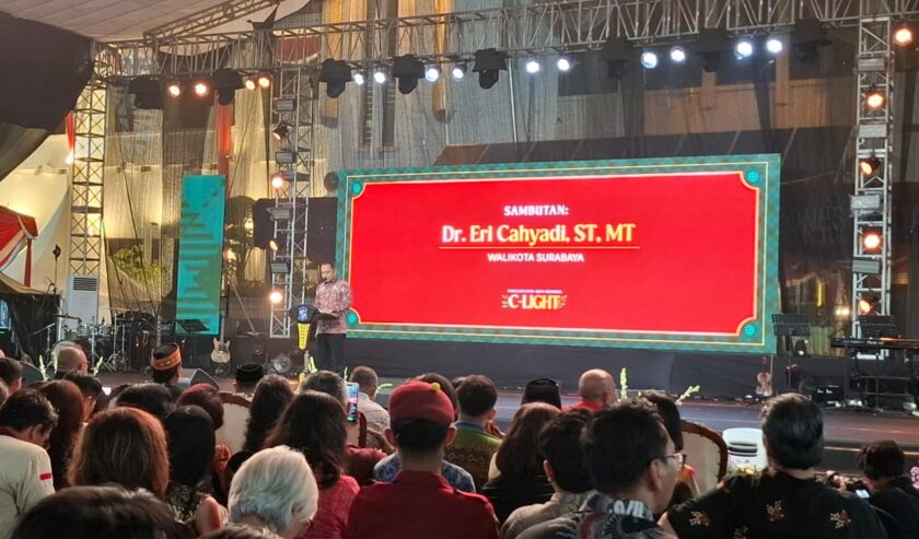 Hujan yang turun di hampir seluruh wilayah Kota Surabaya, tak menyurutkan niat umat Kristiani menghadiri Perayaan Natal yang digelar di Halaman Balai Kota Surabaya, Jumat (9/1/2026).