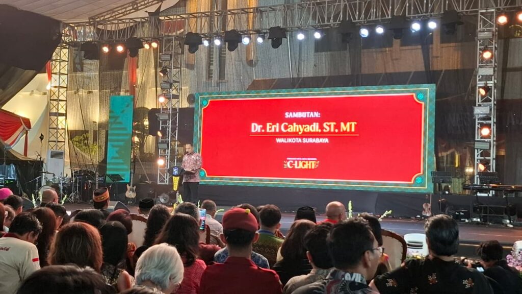 Hujan yang turun di hampir seluruh wilayah Kota Surabaya, tak menyurutkan niat umat Kristiani menghadiri Perayaan Natal yang digelar di Halaman Balai Kota Surabaya, Jumat (9/1/2026).