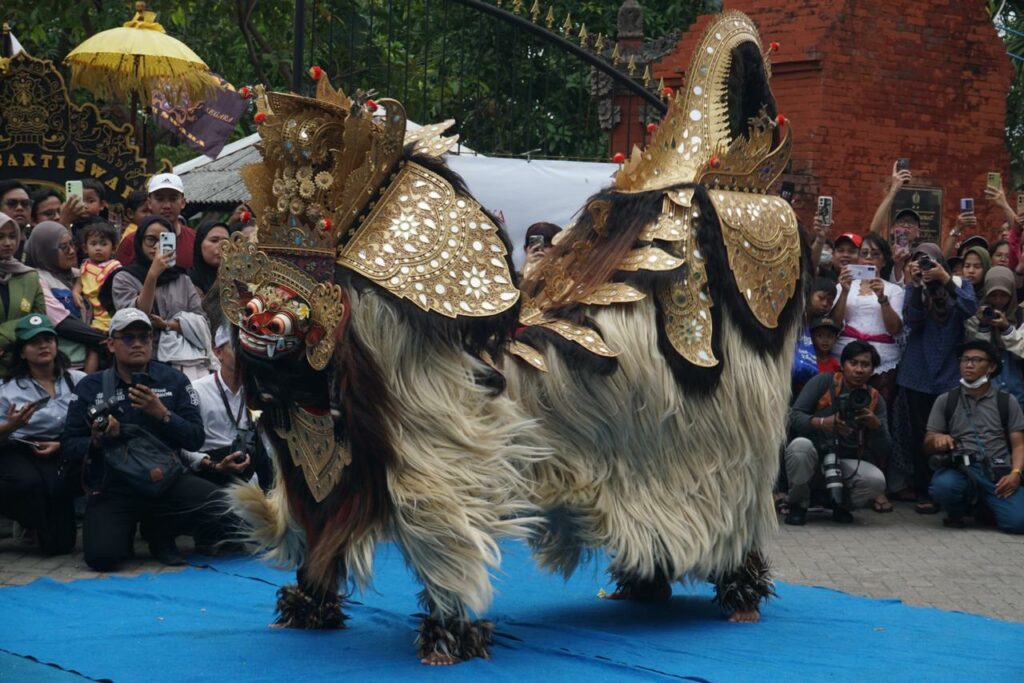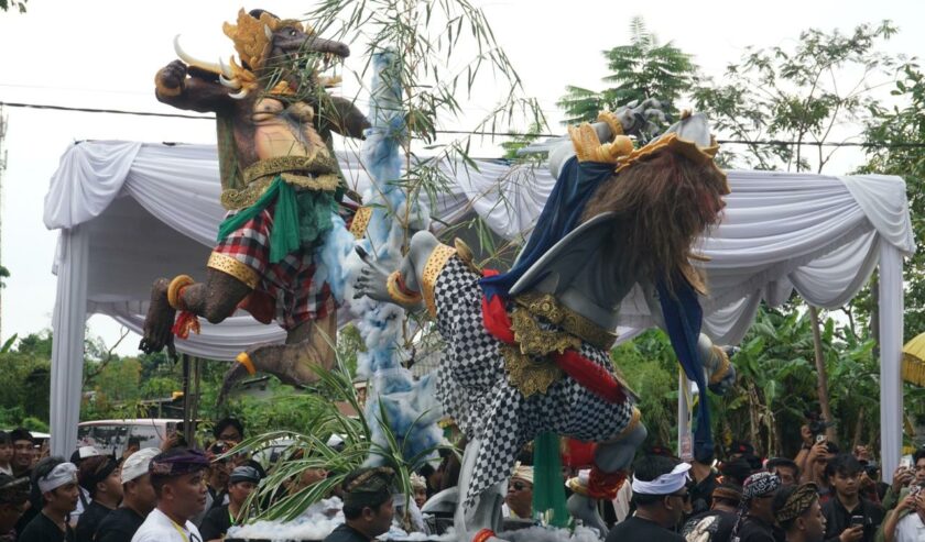 Perayaan Nyepi Tahun Baru Saka 1948/2026, di Pura Segara Surabaya, Jawa Timur, Rabu (18/3/2026) dimeriahkan ikon Suro dan Boyo dalam Pawai Seni Ogoh-ogoh.