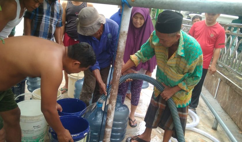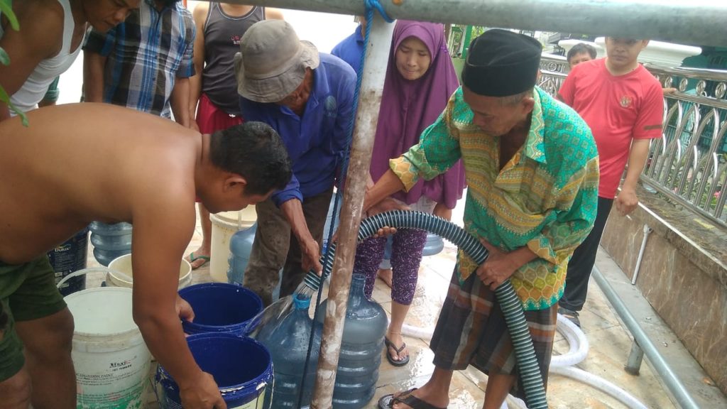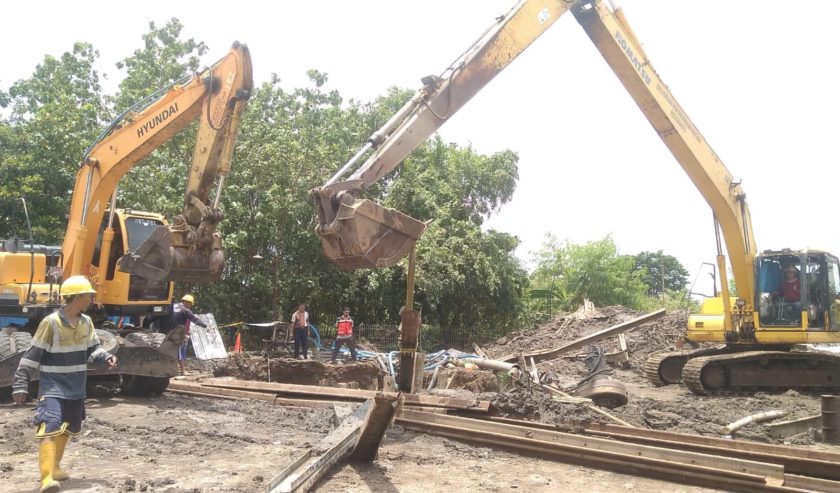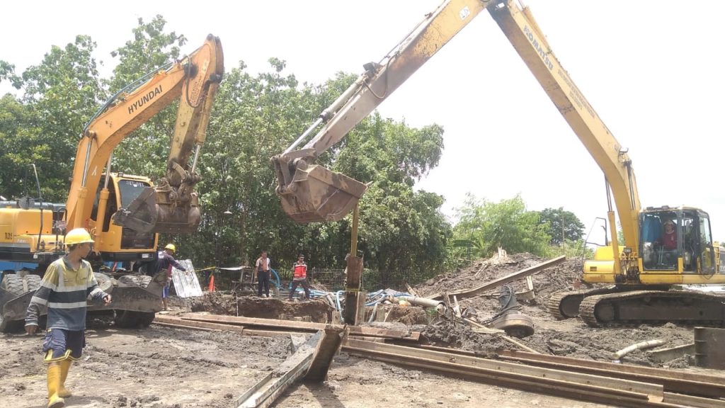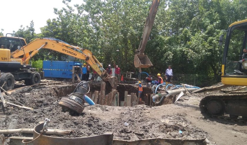 Perbaikan pipa di Purimas mengalami kendala, Sabtu (7/3/2020). Salah satunya karena faktor cuaca. Di dalam pipa terlalu banyak genangan. Sehingga proses pengelasan pada pipa tidak bisa dilakukan. Akibatnya, masyarakat yang terdampak perbaikan kesulitan mendapatkan air. Foto: Denza suarasurabaya.net