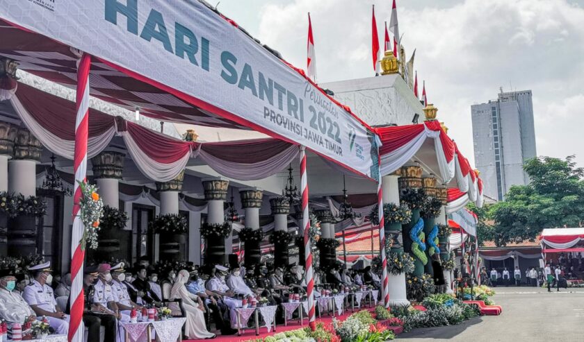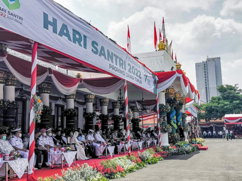 Ratusan santri yang datang dari penjuru Kota di Jawa Timur sejak tadi pagi sudah memenuhi bahu-bahu Jalan Gubernur Suryo, tepatnya di depan Gedung Negara Grahadi, Sabtu (22/10/2022).