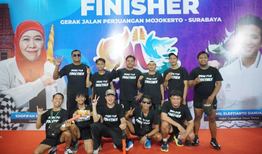 Sejumlah peserta Gerak Jalan Mojokerto-Suroboyo (GMS) tiba di garis finis, tepatnya di Tugu Pahlawan Surabaya pada Sabtu (15/11/2025) malam.
