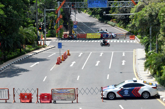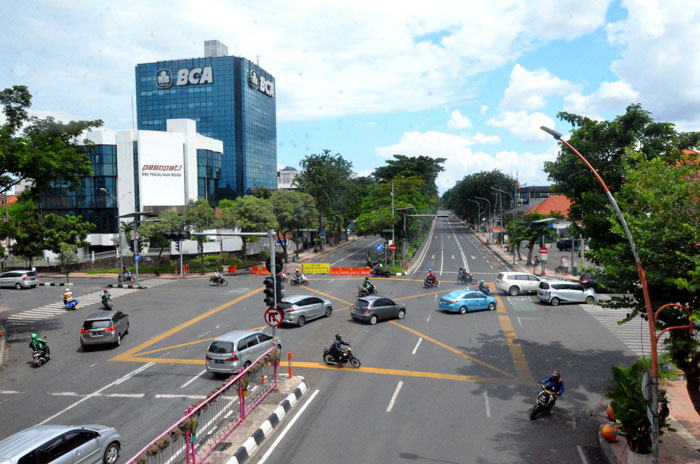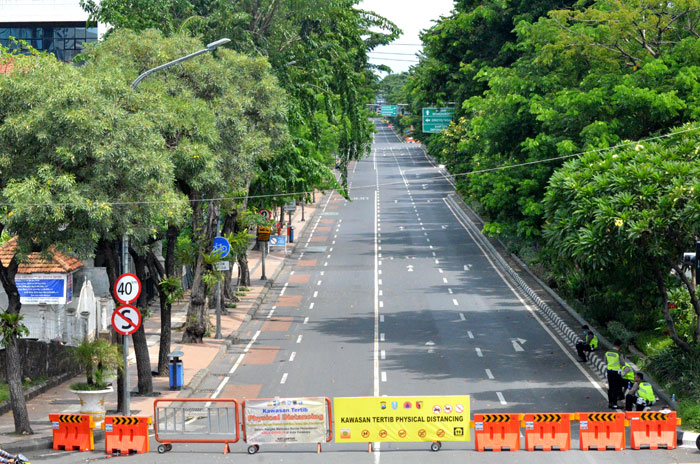 Physical Distancing yang dilakukan di dua ruas jalan besar di Kota Surabaya, masing-masing di Jl. Raya Darmo dan Jl. Tunjungan, Selasa (7/4/2020) kembali diterapkan sebagai satu diantara upaya memutus rantai penyebaran Covid-19 di Kota Surabaya. Masyarakat tidak diperbolehkan melintas kawasan tersebut. Meskipun sebelumnya dilaksanakan hanya dalam batas waktu hitungan jam saja, tetapi pada perkembangannya, penutupan ruas jalan sebagai bagian dari physical distancing kembali diterapkan. Siang hari diterapkan mulai pukul 10.00 sampai pukul 14.00, kemudian digelar kembali pada petang hari mulai pukul 19.00 sampai dengan pukul 23.00. Foto: Totok suarasurabaya.net
