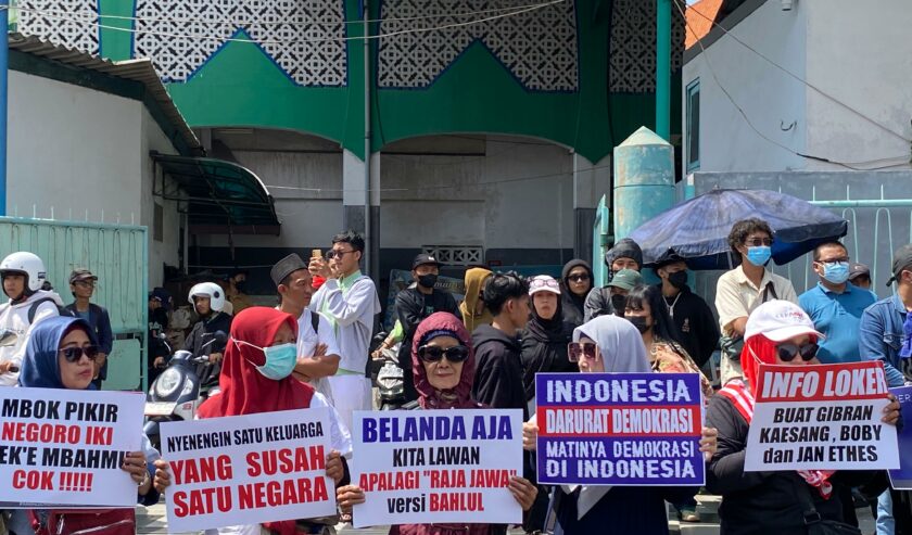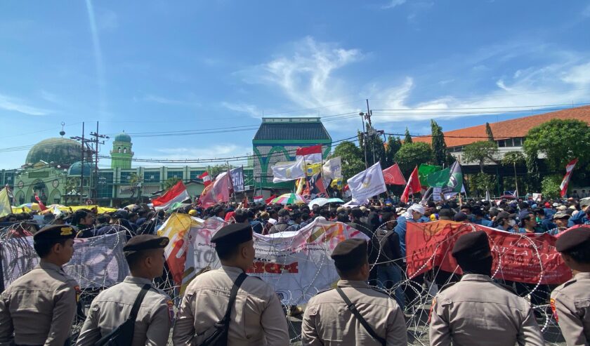 Situasi demo mahasiswa sempat tidak kondusif memasuki pukul 13.45 WIB, Jumat (23/8/2024). Massa aksi melempari botol ke arah petugas kepolisian yang melakukan penjagaan di depan Gedung DPRD Jatim.