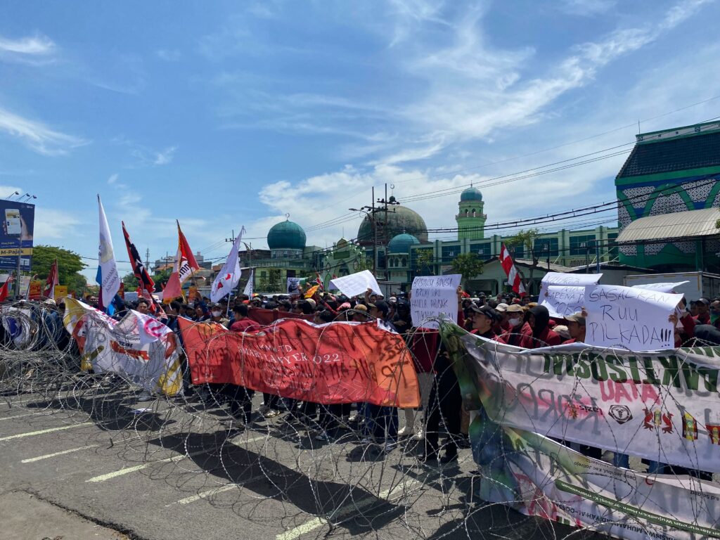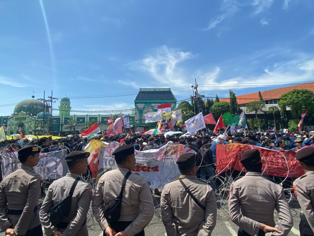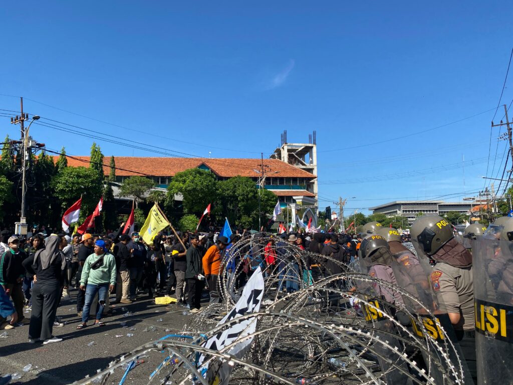 Situasi demo mahasiswa sempat tidak kondusif memasuki pukul 13.45 WIB, Jumat (23/8/2024). Massa aksi melempari botol ke arah petugas kepolisian yang melakukan penjagaan di depan Gedung DPRD Jatim.