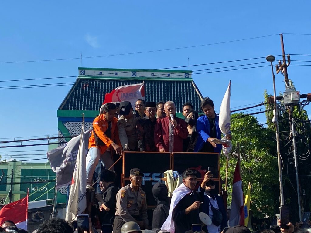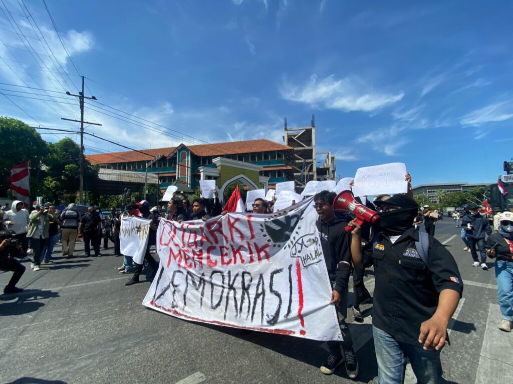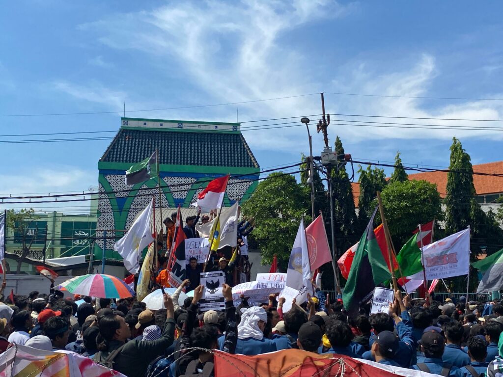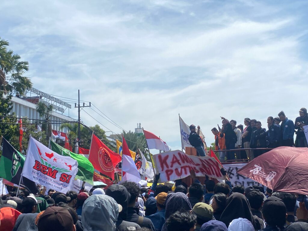 Ratusan mahasiswa dari berbagai kampus mulai menggeruduk Gedung DPRD Provinsi Jawa Timur, Jumat (23/8/2024) untuk menggelar demonstrasi mengawal putusan Mahkamh Konstitusi (MK).