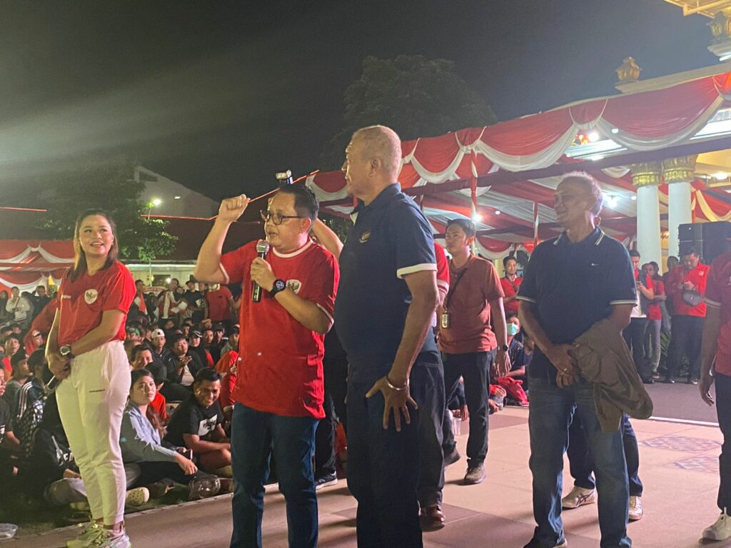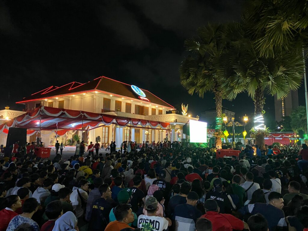 Menjelang dimulainya laga Timnas U-23 melawan Timnas Uzbekistan U-23 di laga Semifinal Piala Asia U-23, ribuan orang berbondong-bondong memadati Gedung Negara Grahadi, Surabaya, Senin (29/4/2024) malam.