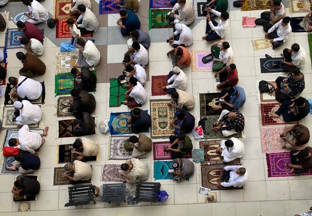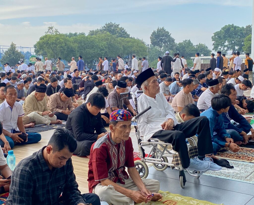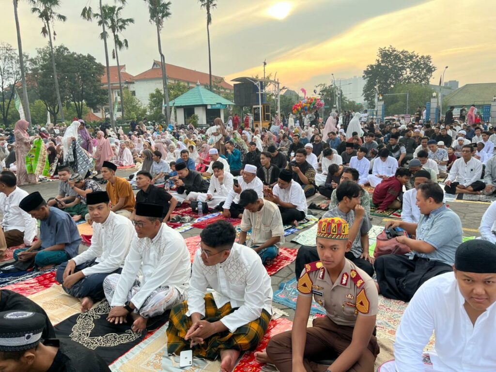 Di tengah suara takbir yang terus menggema, ribuan warga tampak terus berdatangan baik bersama keluarga maupun rombongan.