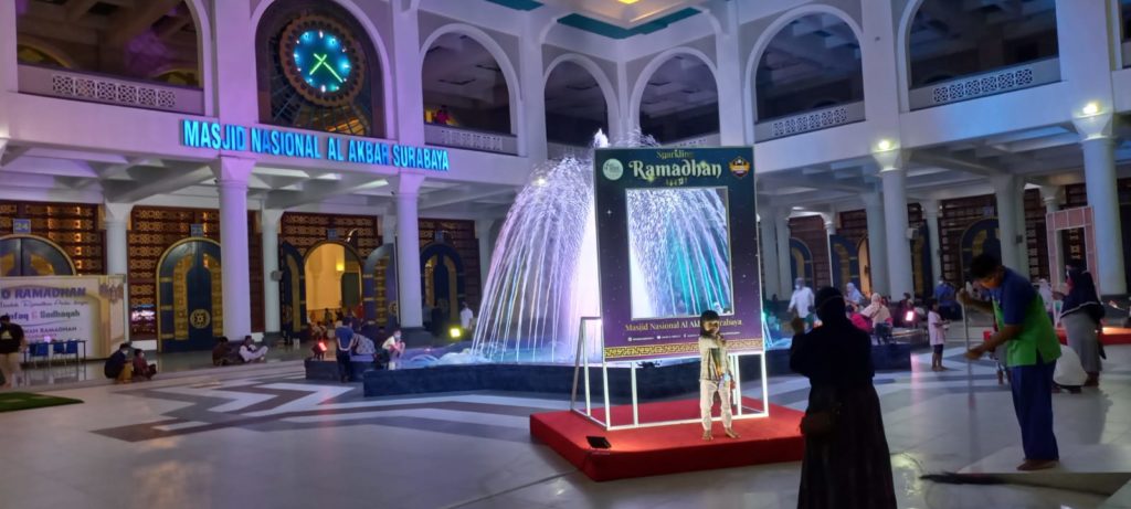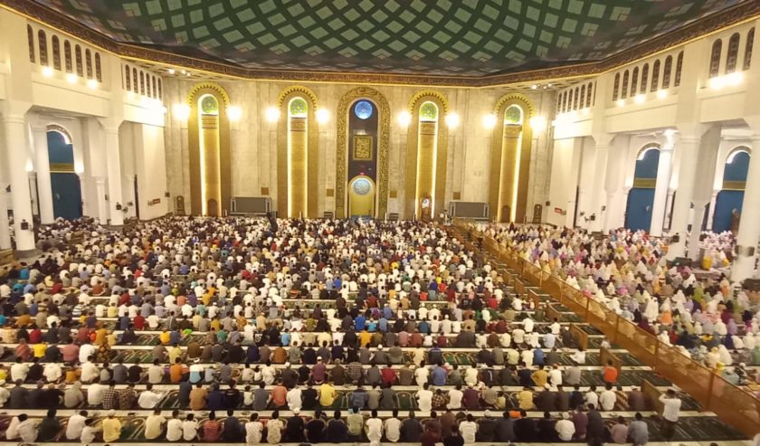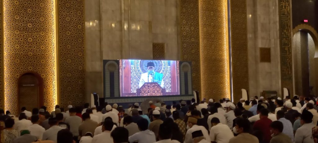 Hari pertama pelaksanaan Ibadah salat tarawih Bulan Suci Ramadan 1443 Hijriyah di Masjid Agung Nasional Al-Akbar Surabaya, Sabtu (2/4/2022). Ribuan jemaah tampak memadati aula dalam masjid, dengan tetap menerapkan protokol kesehatan.
