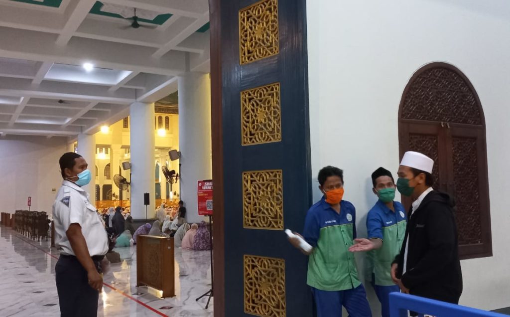 Jemaah juga dibagikan kantung tas kresek yang mayoritas digunakansebagai wadah sandal dan ditaruh tepat di depan shaf mereka yang diberi jarak 50 sentimeter.
