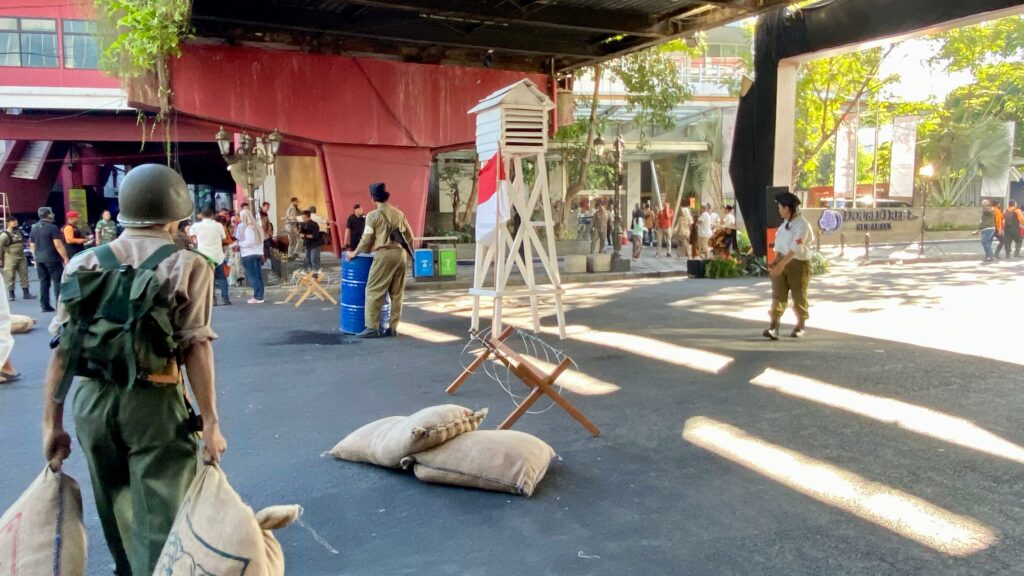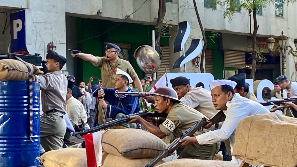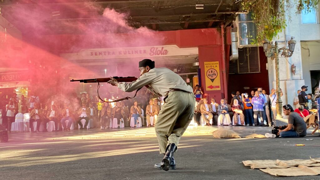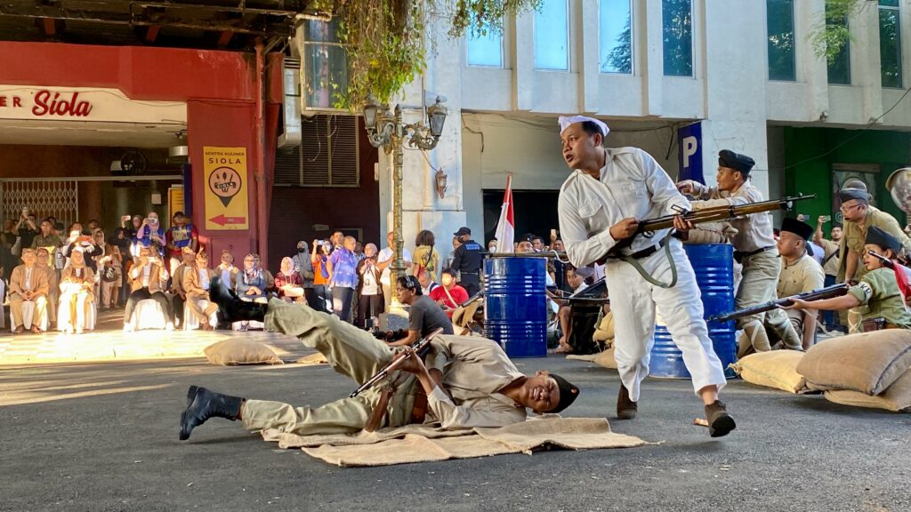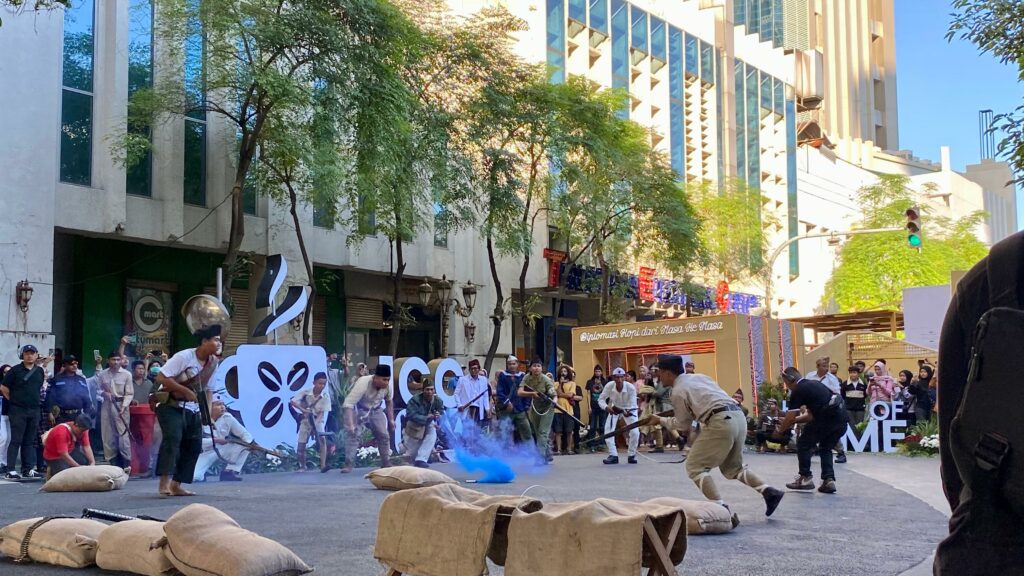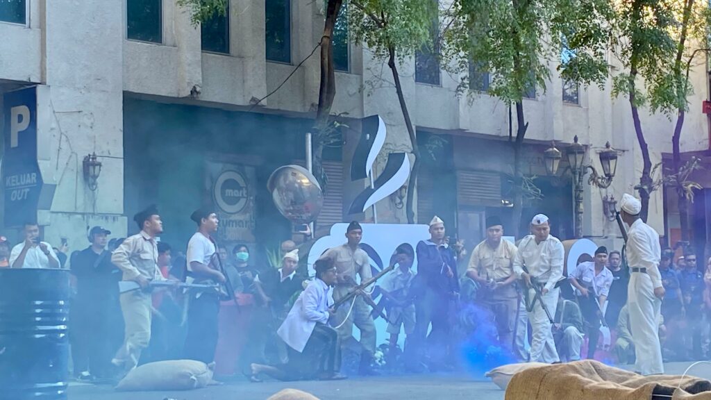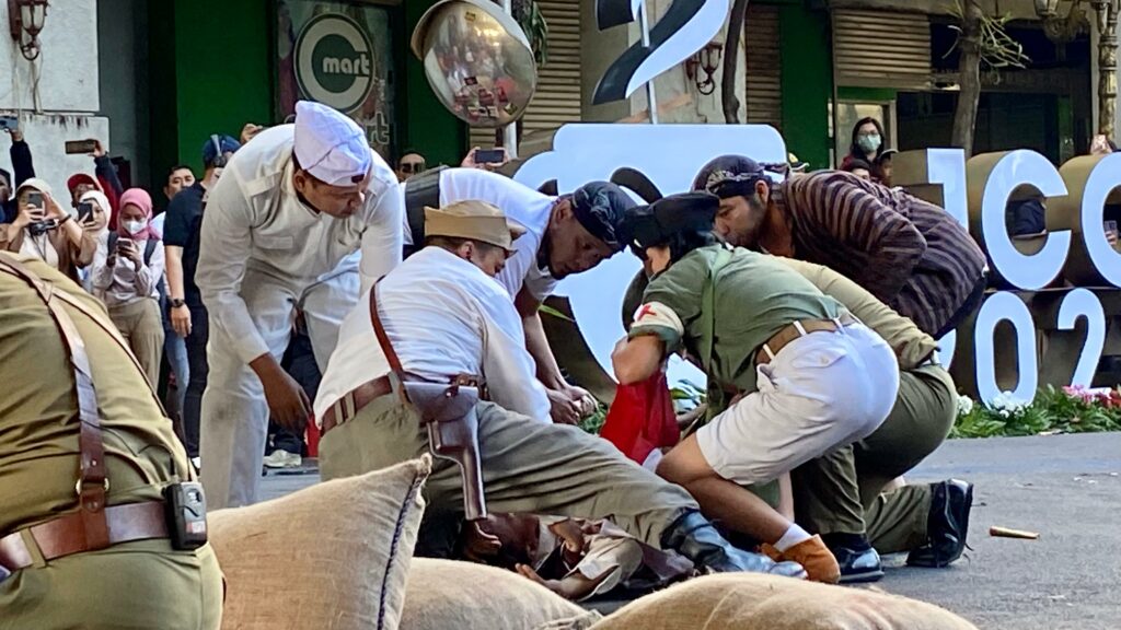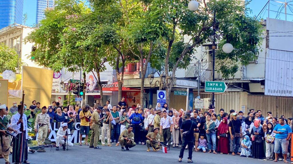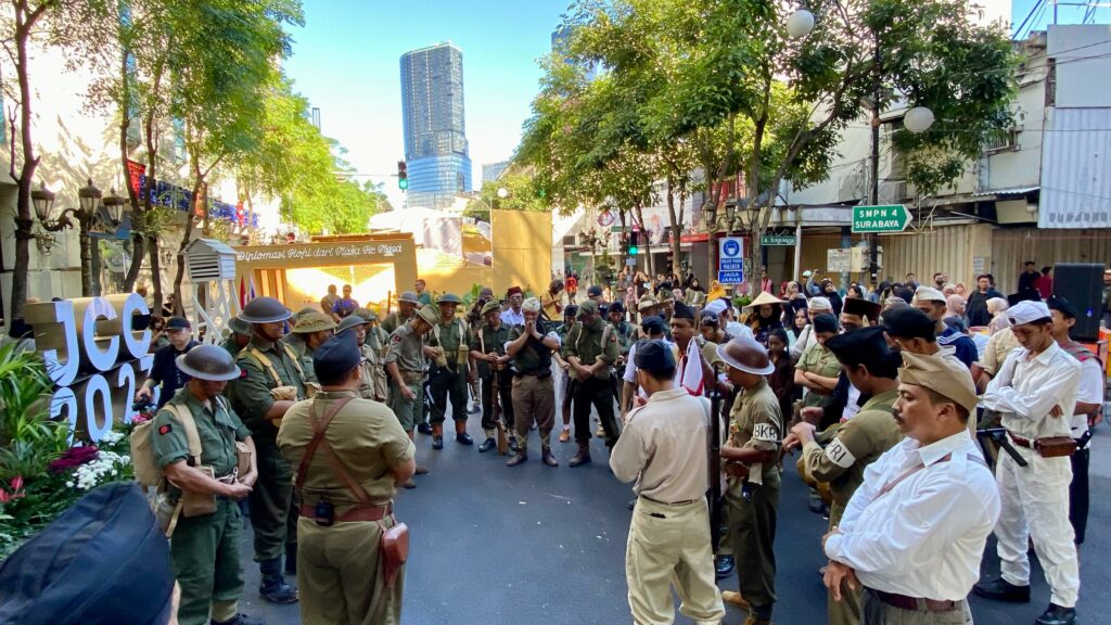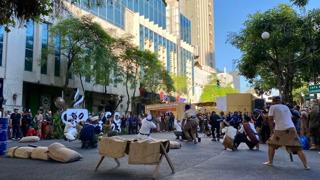 JCC 2023 & Festival Peneleh yang hadir di Jalan Tunjungan Surabaya, menampilkan sebuah teatrikal bertakjub “Teaktrikal Soerabaja Tempoe Doeloe”, yang menunjukan tentang perjuangan Arek-Arek Suroboyo dalam melawan tentara penjajah. (dvn)