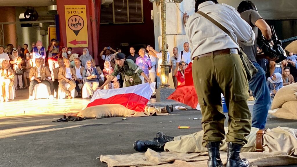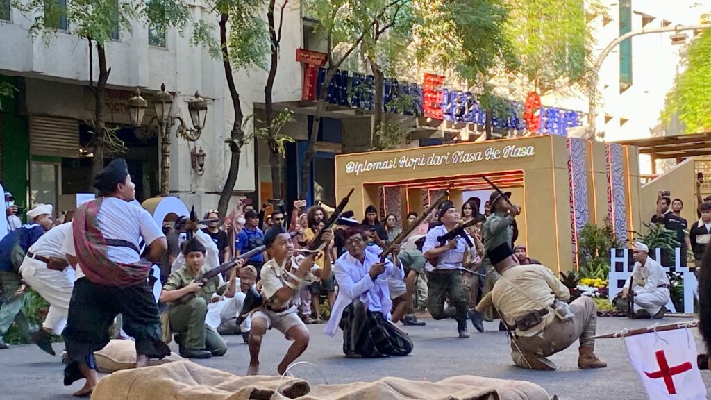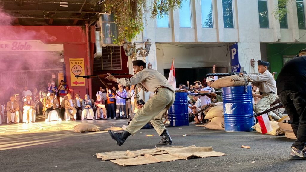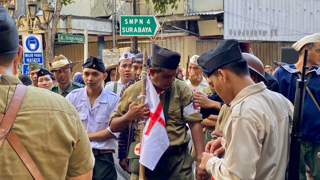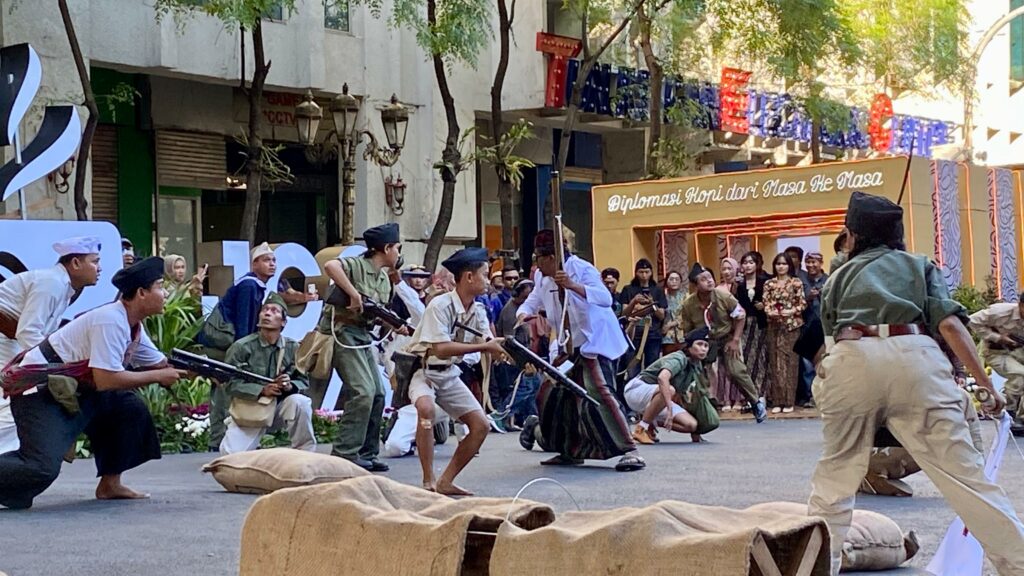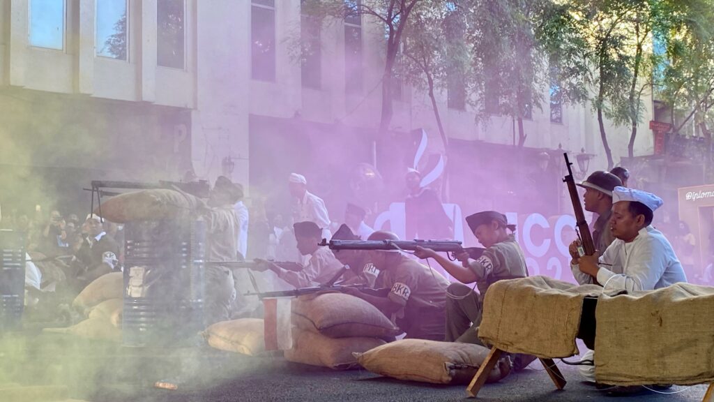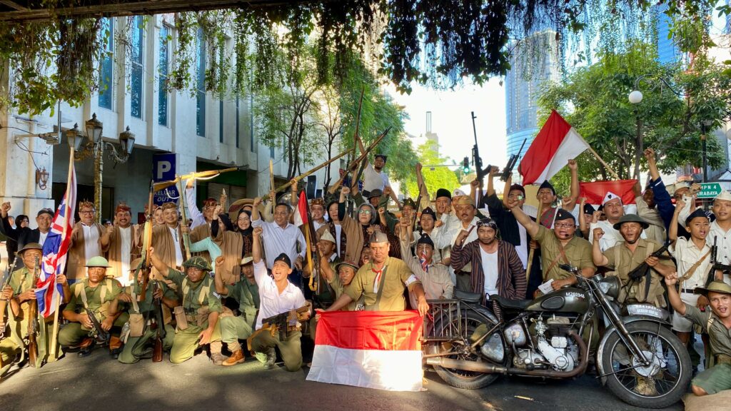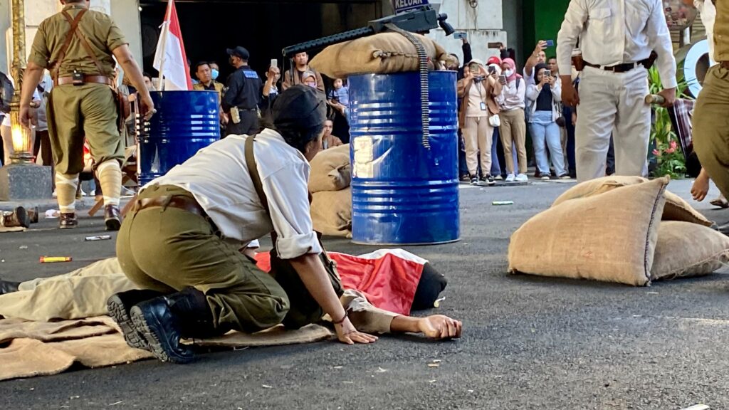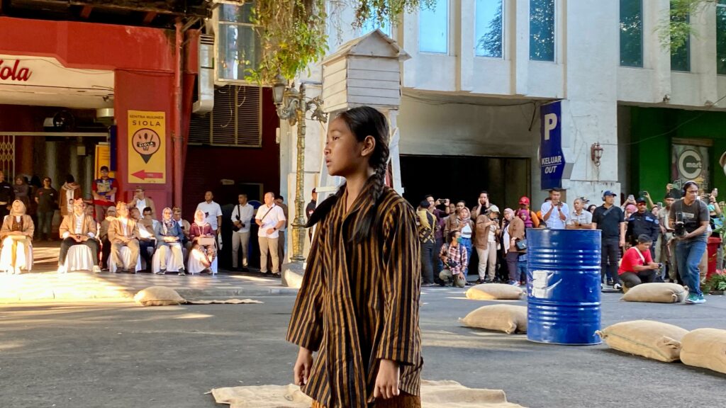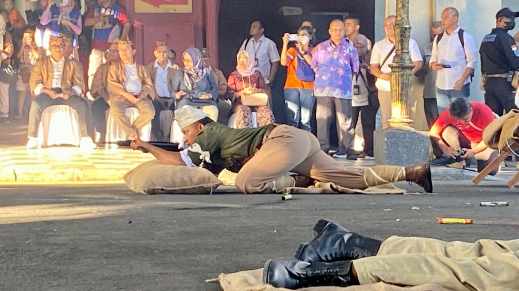 JCC 2023 & Festival Peneleh yang hadir di Jalan Tunjungan Surabaya, menampilkan sebuah teatrikal bertakjub “Teaktrikal Soerabaja Tempoe Doeloe”, yang menunjukan tentang perjuangan Arek-Arek Suroboyo dalam melawan tentara penjajah. (dvn)