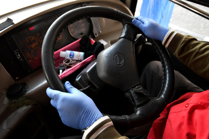 Setelah pelaksanaan pembatasan sosial berskala besar (PSBB) hingga 3 kali, dilanjutkan dengan PSBB transisi menuju new normal, Selasa (9/6/2020) terminal Purabaya, Bungurasih Sidoarjo kembali beroperasional. Kembali dibuka dan beroperasionalnya terminal terbesar di kawasan Indonesia timur tersebut dilengkapi dengan sejumlah protokol kesehatan pencegahan penyebaran Covid-19. “Kami ingin protokol kesehatan diberlakukan secara ketat kepada para awak bus, armada bus sekaligus juga masyarakat calon penumpang. Ini sebagai upaya memutus rantai penyebaran Covid-19 sekaligus bagian dari era new normal,” terang Imam Hidayat kepala sub unit terminal Purabaya, Bungurasih Sidoarjo. Satu diantara protokol kesehatan yang wajib dipatuhi awak bus adalah penggunaan masker, sarung tangan, serta surat sehat. Mereka yang tidak memenuhi protokol kesehatan tidak diperbolehkan memasuki terminal dan mengangkut penumpang. Seorang pengemudi bus dengan sarung tangan karet warna biru. Foto: Totok suarasurabaya.net