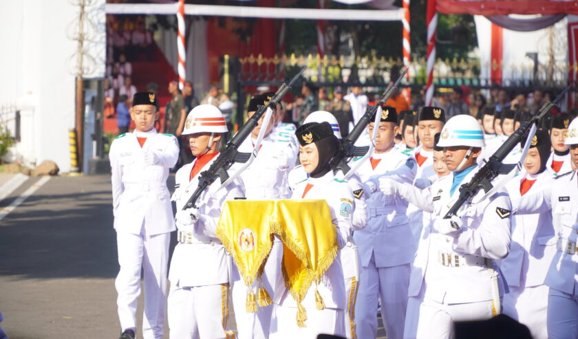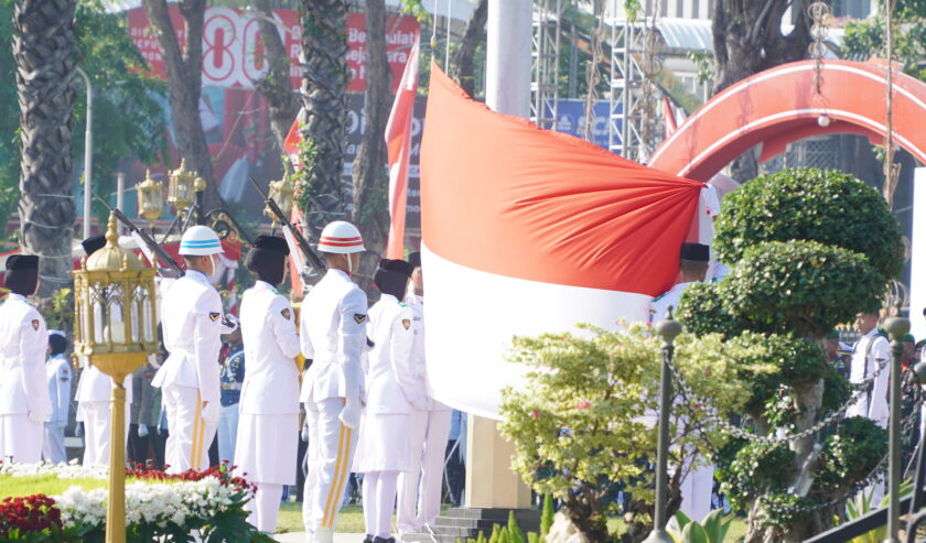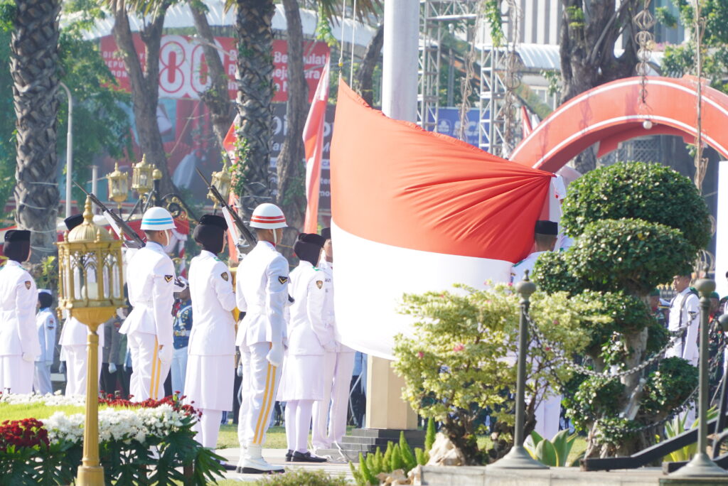 Upacara Hari Ulang Tahun (HUT) ke-80 Republik Indonesia yang diadakan oleh Pemerintah Provinsi (Pemprov) Jatim berlangsung khidmat di halaman Gedung Negara Grahadi, Surabaya, Minggu (17/8/2025).
