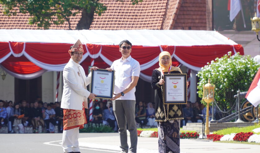 Pembentangan bendera tersebut, sekaligus mencatatkan rekor MURI yang penyerahannya langsung dilakukan MURI kepada Khofifah Gubernur di halaman Gedung Negara Grahadi Surabaya.