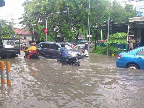 Air setinggi lutut orang dewasa juga membanjiri Darmo Satelit, Surabaya, Rabu (10/2). Beberapa sepeda motor yang lewat harus dituntun karena air menyentuh mesin dan menyebabkan mogok. (ham)