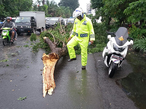 Evakuasi pohon tumbang di depan Giant Waru arah Surabaya, Selasa (27/3/2018) siang. Pohon tumbang ini sempat menutup dua lajur di sebelah kiri dan menyisakan lajur kanan yang dapat dilewati. (agn)