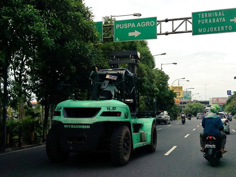 Forklift melintas di jalan Bundaran Waru, Rabu (20/7). Padahal menurut Budi Rianto Inspektur K3 (Keselamatan dan Kesehatan Kerja), ecara definisi, forklift di jalan raya itu sudah salah. Hal itu tertuang dalam aturan penggunaan forklift sudah tertera dalam Permenaker No.05/85 tentang pesawat angkat angkut. (ham)