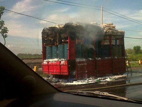 Gandengan truk muat cat dan thinner terbakar di sebelah barat RSU Muhammadiyah Lamongan, Kamis (29/1/2015) pagi. Api sempat dipadamkan oleh 2 mobil PMK. Lalu lintas sempat diatur buka tutup, yang berdampak kemacetan, bahkan terjadi antrean sejak Ploso Wahyu Lamongan. (ras/ipg)