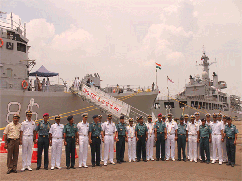 Para pejabat Angkatan Laut India dan Indonesia saling bergandengan tangan di depan kapal perang India di Dermaga Jamrud Utara Surabaya, Minggu (1/3/2015).(iss/ipg)