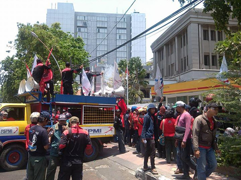 Karyawan Maspion yang tergabung dalam kelompok buruh FSPMI melakukan unjuk rasa di depan Bank Maspion, jalan Basuki rahmat Surabaya, Rabu (30/9). Massa memakai atribut merah-merah dan mulai berjalan dari Basuki Rahmat hingga menyebabnkan kemacetan arus lalu lintas. (ham)