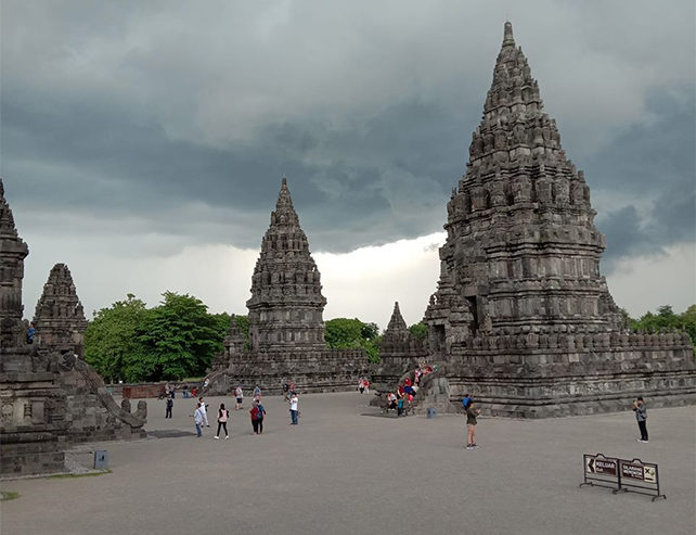 Candi Prambanan berlatar langit mendung pada Jumat (7/2/2020) sore.