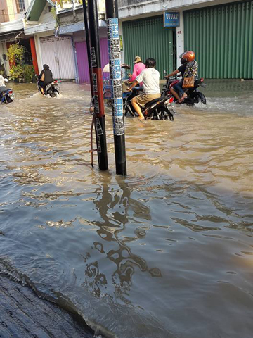 Ketinggian banjir, Kamis (25/2) sampai setinggi setengah ban sepeda motor. (ras)