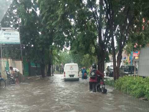 Kondisi banjir di depan pintu masuk RS Mitra Keluarga Satelit, Rabu (10/2). Tampak seorang pengendara motor menuntun sepeda motornya melewati banjir ini. (ham)
