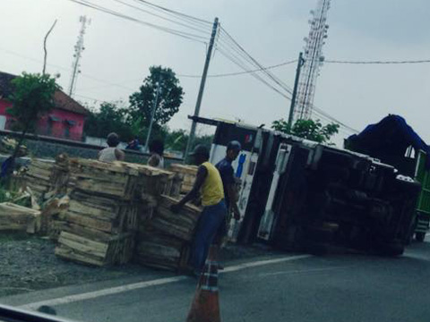 Truk muat buah mangga terguling dilajur kiri Raya Sukodadi Lamongan arah Babat, muatannya tumpah ke bahu jalan. (ras)