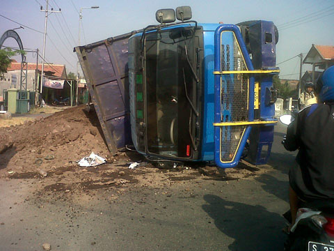 Kondisi truk W 8864 UN asnya patah lalu terguling di dekat Perumahan Kodam V Brawijaya Raya Ketajen Gedangan pada Senin, 14 Oktober 2013. Kompol Kamran- Kapolsek Gedangan Sidoarjo mengatakan bahwa saat ini masih dilakukan pengaturan lalu lintas. Hanya Mobil kecil yang bisa lewat bergantian. Saat ini sedang diusahakan pemindahan sirtu yang tercecer ke jalan. Sopir dalam kondisi selamat. (rti)