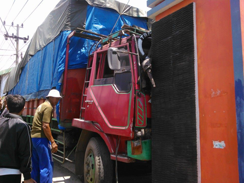 Sebuah truk tabrak warung di jalan Roomo Manyar Gresik, (30/3/2015). Menurut saksi di sekitar lokasi, truk tersebut remnya blong. Kecelakaan ini sempat menyebabkan arus macet dua arah karena posisi truk melintang. (ham)