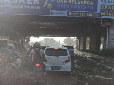 Kondisi banjir di Jalan Jati Sidoarjo, Kamis (1/4/2021) pagi. Banjir setinggi setengah ban sepeda motor ini karena hujan deras yang mengguyur sehari sebelumnya (31/3/2021). Akibatnya, lalu lintas macet. (ham)