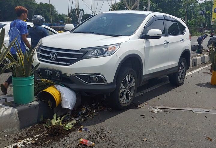 Kecelakaan lalu lintas di Gunungsari – Wonokromo, Selasa (10/3) siang. Mobil naik ke median jalan. Lalu lintas Macet. (prm)