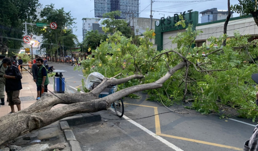 Pohon tumbang di depan Stasiun Gubeng menutup separuh jalur arah ke JL Sulawesi. Lalu lintas diatur contraflow. Ada pengendara sepeda motor yang tertimpa pohon, sudah ditangani PMI.