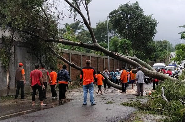 Pohon tumbang di jalur Pacet Mojokerto, Minggu (7/2/2021) siang. Posisinya melintang di jalan dan menutup jalur. (ham)