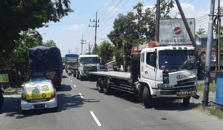 kecelakaan truk trailer nabrak tiang listrik di Raya Cangkir Driyorejo arah Karangpilang. Lalu lintas mulai MACET karena setengah jalur tertutup