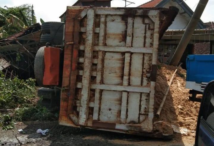 Dump truk terguling di Karangandong Driyorejo Gresik, Selasa (24/11/20). Lalu lintas arah Krian macet