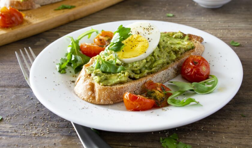 Roti panggang alpukat dengan telur dan tomat panggang. Foto Istock