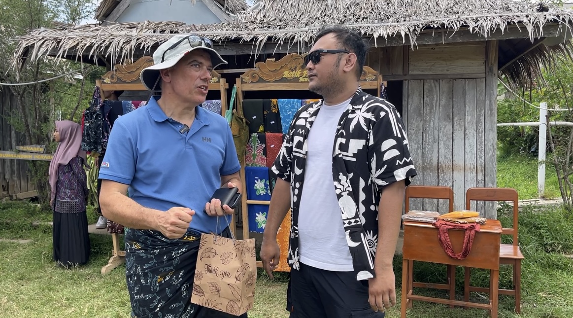 Everyone is very friendly and the beach is very nice. I’m just trying to make some batik. I did the wax stamp, and then coloring and i just bought one (Semua orang sangat ramah dan pantainya sangat bagus. Saya coba membatik batik, lalu mewarnainya juga. Dan saya baru saja membeli satu batik),” ungkap Peter sembari menunjukkan batik yang baru dibelinya.