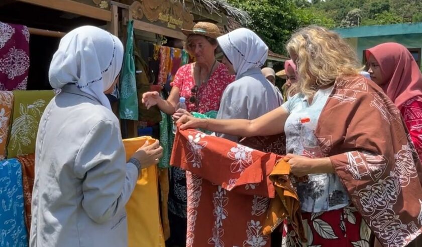 Para wisatawan mancanegara berbelanja batik di Pondok Penaber, Desa Sukaoneng, Kecamatan Tambak, Sabtu (11/10/2025). Foto: Gana suarasurabaya.net