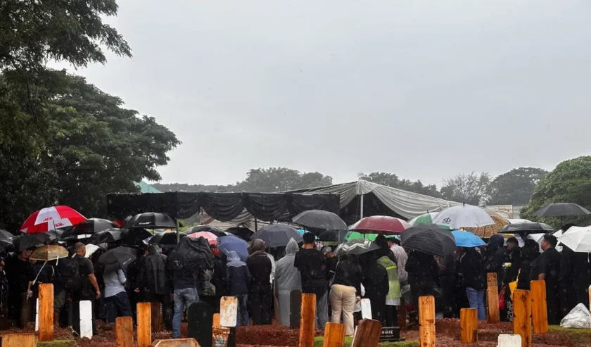 Hujan mengguyur area permakaman saat prosesi berlangsung. Sejumlah keluarga, kerabat dekat, serta warga sekitar terlihat memadati area depan pemakaman untuk memberikan penghormatan terakhir kepada sang penyanyi.