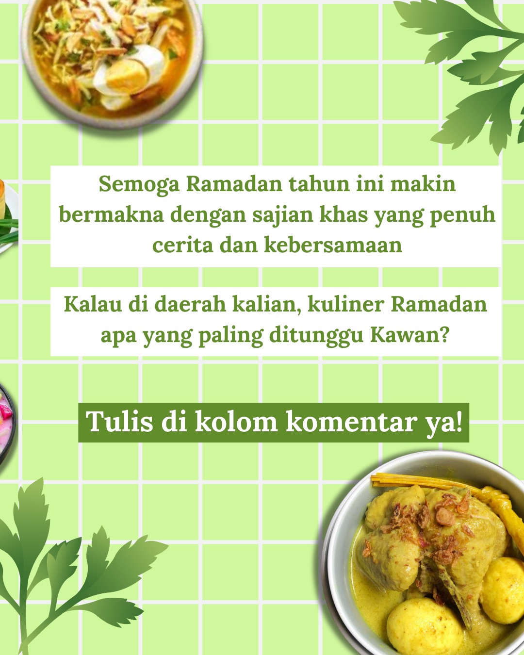 Ramadan di Indonesia tak pernah lepas dari tradisi berbuka puasa dengan hidangan manis seperti es buah, kolak pisang, kurma dan juga gorengan yang tidak pernah ketinggalan. Namun di balik popularitas itu semua, setiap daerah di Nusantara juga memiliki kuliner khas Ramadan masing- masing.